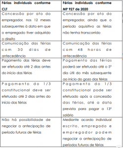 Para melhor visualização e compreensão das alterações realizadas pela Medida Provisória em relação as férias individuais, segue quadro comparativo entre a regulamentação das férias pela CLT e as alterações implantadas no período de calamidade pública (MP 927,2020).